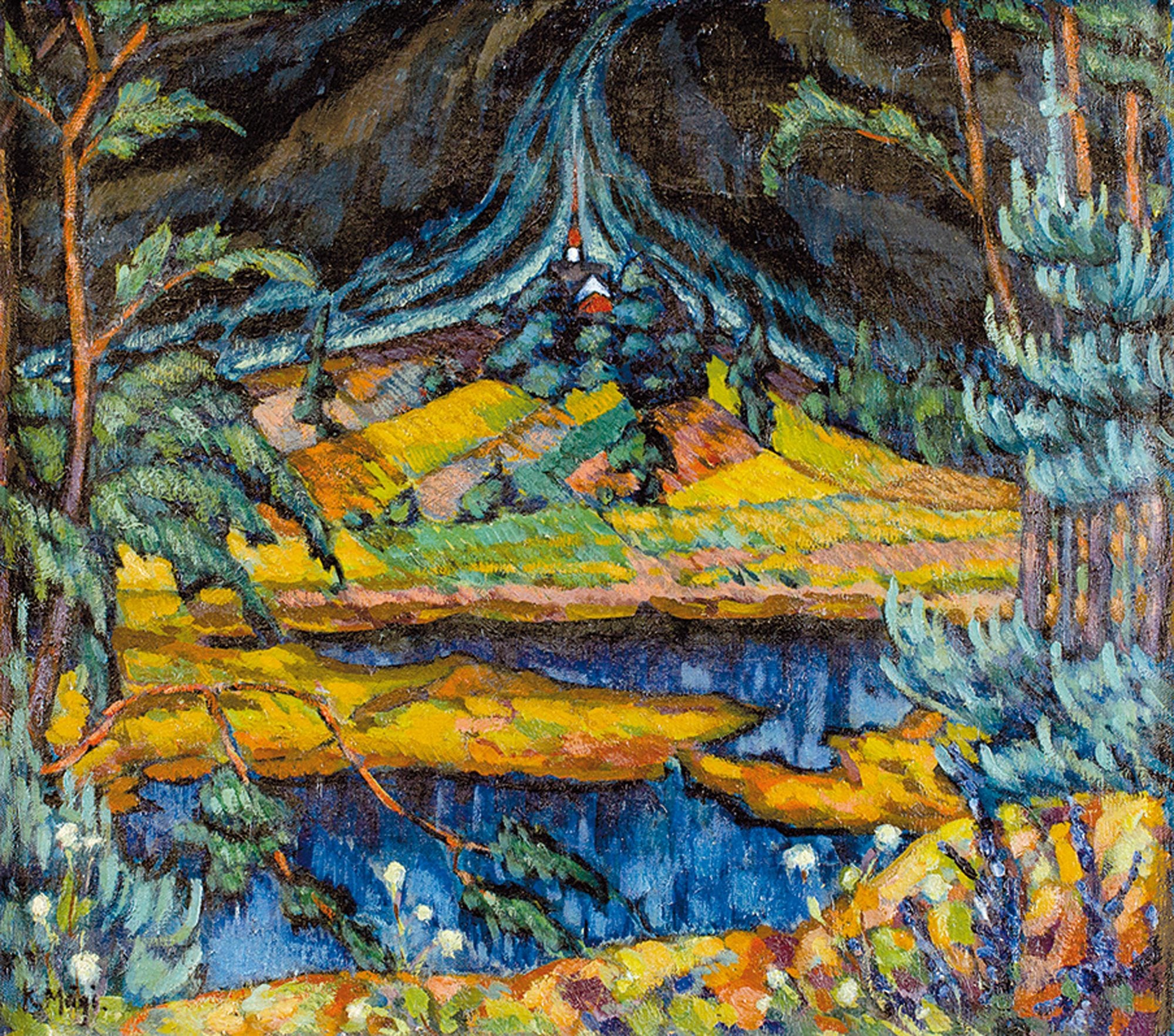 The tradition of depicting lakes was not uncommon either in the work of Mägi or in painting traditions of the late 19th century or early 20th century in general. In particular, there were many artists from the Nordic countries who made lakes the setting and central motif of their paintings. While Mägi’s oeuvre includes only a few works where a lake becomes the star of the painting (e.g., Lake Verijärv), the lake was often more central in the works by Nordic artists. Sometimes it is a setting; sometimes a romantic background; sometimes it serves identity politics goals, used to define a narrower social group or liken an entire nationality to nature. In Mägi’s paintings, the lake is generally a functional compositional element: its task is to imbue the landscape forms with rhythm and tone colour. Bluish patches of colour nestled in rolling low hills often have merely decorative or delineative value.