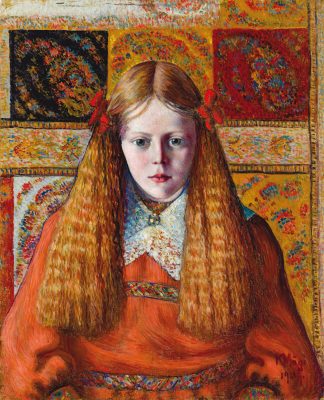 The background deserves attention – the ornamental background became a predominant feature in Mägi’s portraits – as does the girl’s hair. They are reminiscent of a labyrinth; the girl’s white collar and tapestry also are like intricate arabesques. Depiction of abstract labyrinths in women’s hair (including in paintings by Edvard Munch and Gustav Klimt) was a way of symbolizing mystical unworldly power, but Munch and Klimt also imbued it with a strong erotic charge. While the model in Mägi’s painting is not sexualized, the work is the most psychological portrait by Mägi, as he would subsequently prettify and idealize his models