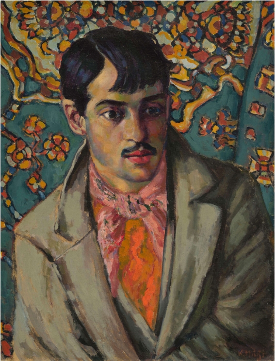 As with the Romani girl, Konrad Mägi also probably painted this portrait of a young Romani man in the late winter of 1915 in Viljandi, (see Romani Girl, Art Museum of Estonia). Unlike the girl, the man is of Russian origin, as he is not as dark-complexioned as the girl. He, too, appears to be from the upper echelons of Romani society, as indicated above all by his costly blazer. Zalina Dabla, the chairwoman of the Estonian Roma, says this may even signify that the model is the chieftain’s son. The head covering is a usual part of Romani sartorial culture; his moustache is a cultural norm, as it distinguished a man from a boy and was a symbol of masculinity and never shaved off. The tapestry behind his back is not hand-woven but a wall covering from Russia with a fairly ordinary pattern.