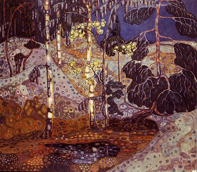 Comparing it to Mägi’s painting, we see a number of parallels on the visual level as the painting has a number of birches and silvery bubbles rising from a dark bog pond. There are also parallels in the way the bog has been associated with visionary, dream-like, indefinite states, where forms change and there is no firm footing to be felt. The synchronous appearance of bog themes in modern Estonian literature and art and the resulting mystification of nature is noteworthy and may signal a certain generational attitude that is sustained by nature and related folklore but also makes them a sounding-board for personal psychological tensions and a proving ground for modern searches for form.